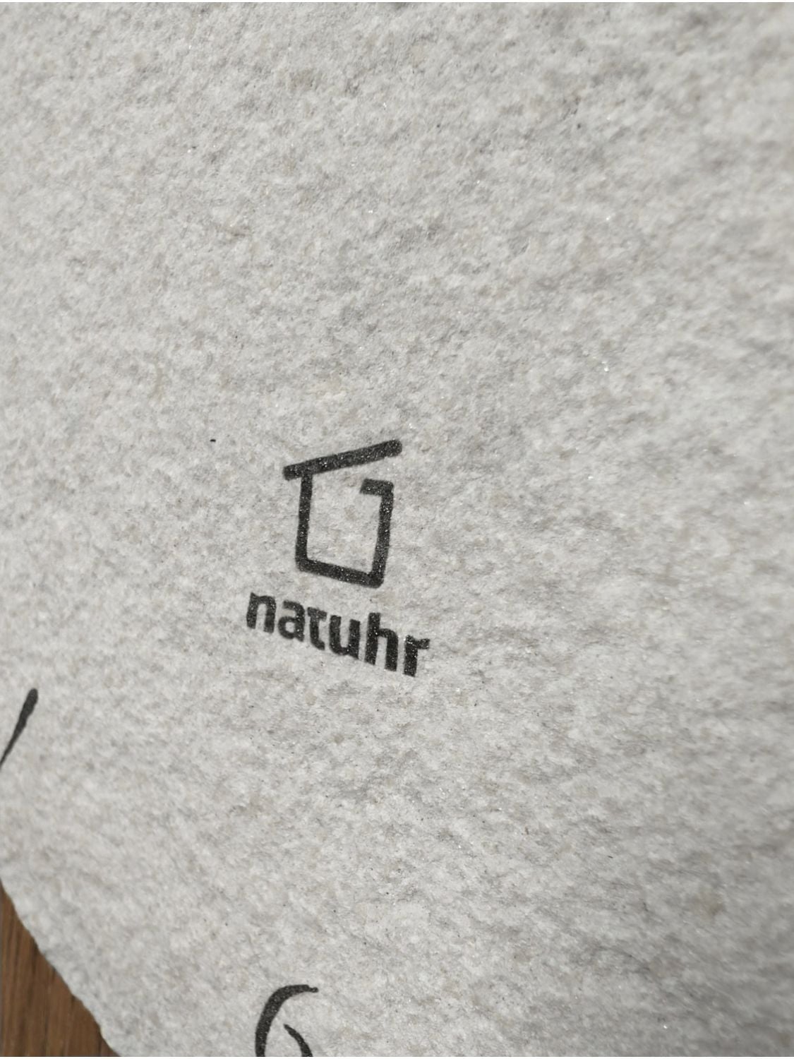 • hellgraues Sandstein-Zifferblatt mit dezenten schwarzen Zahlen und Indizes