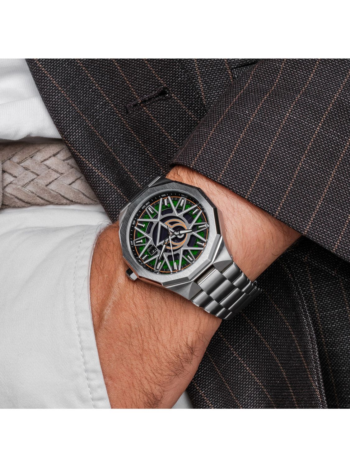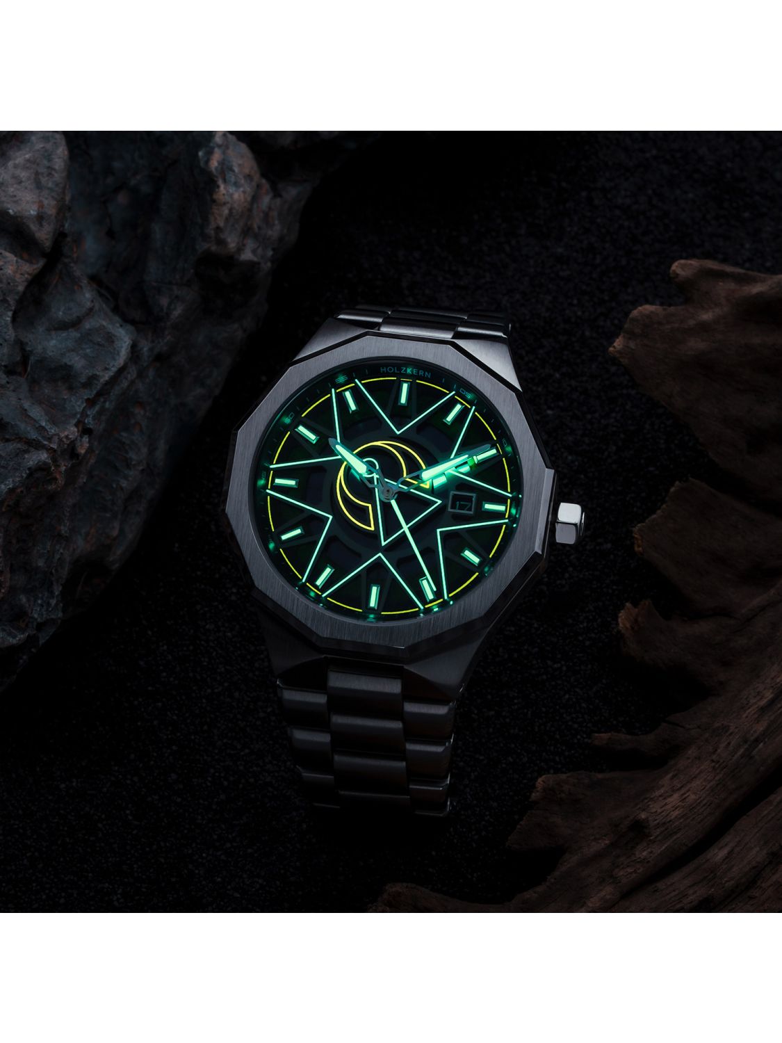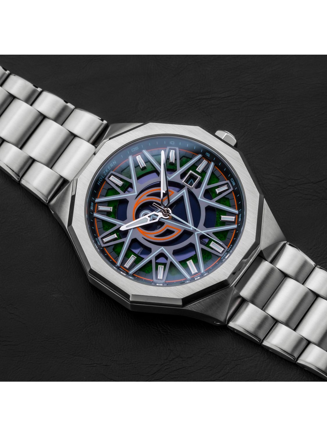 • Zifferblatt aus grünem Moosachat mit nachleuchtenden Elementen
